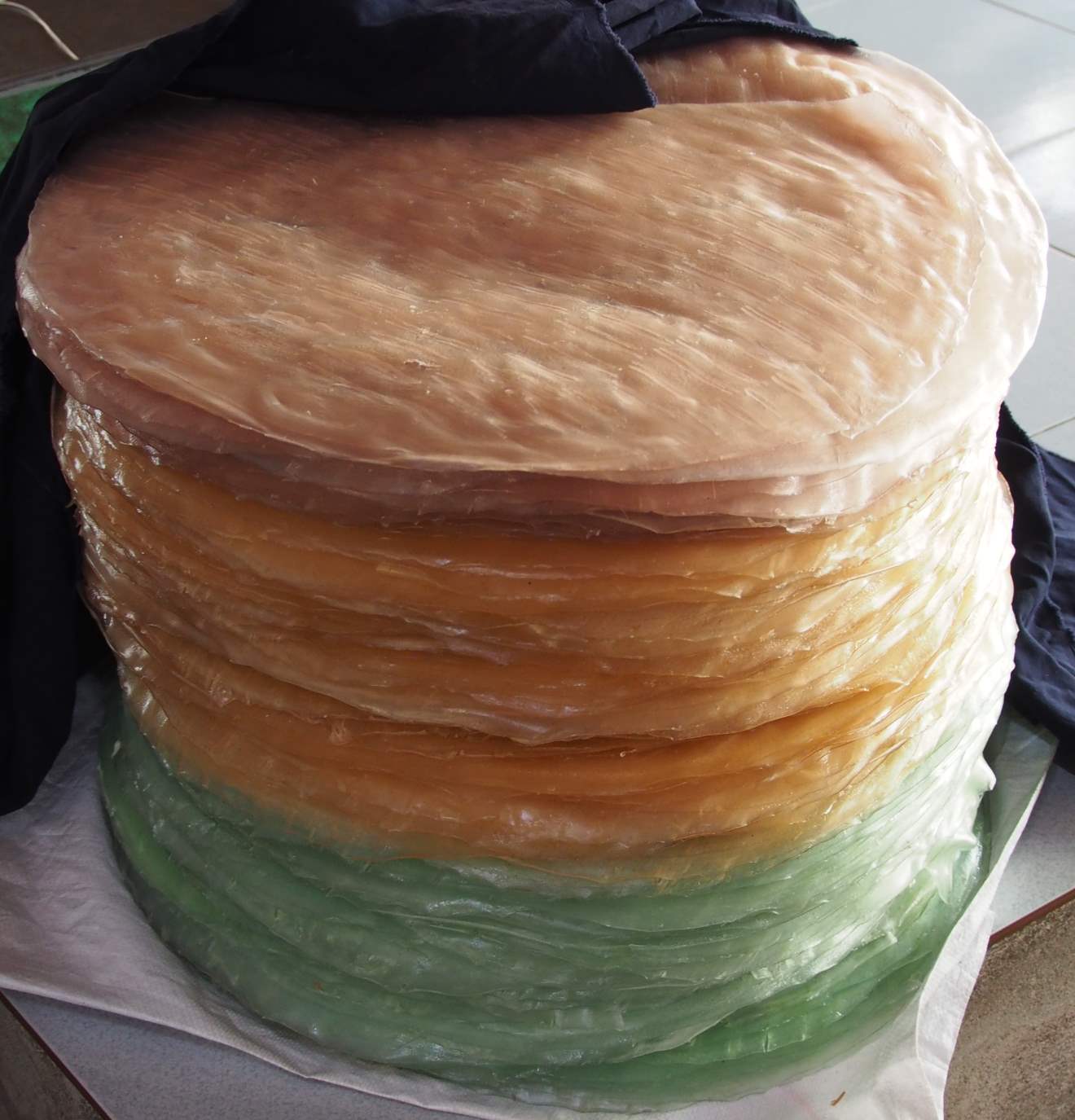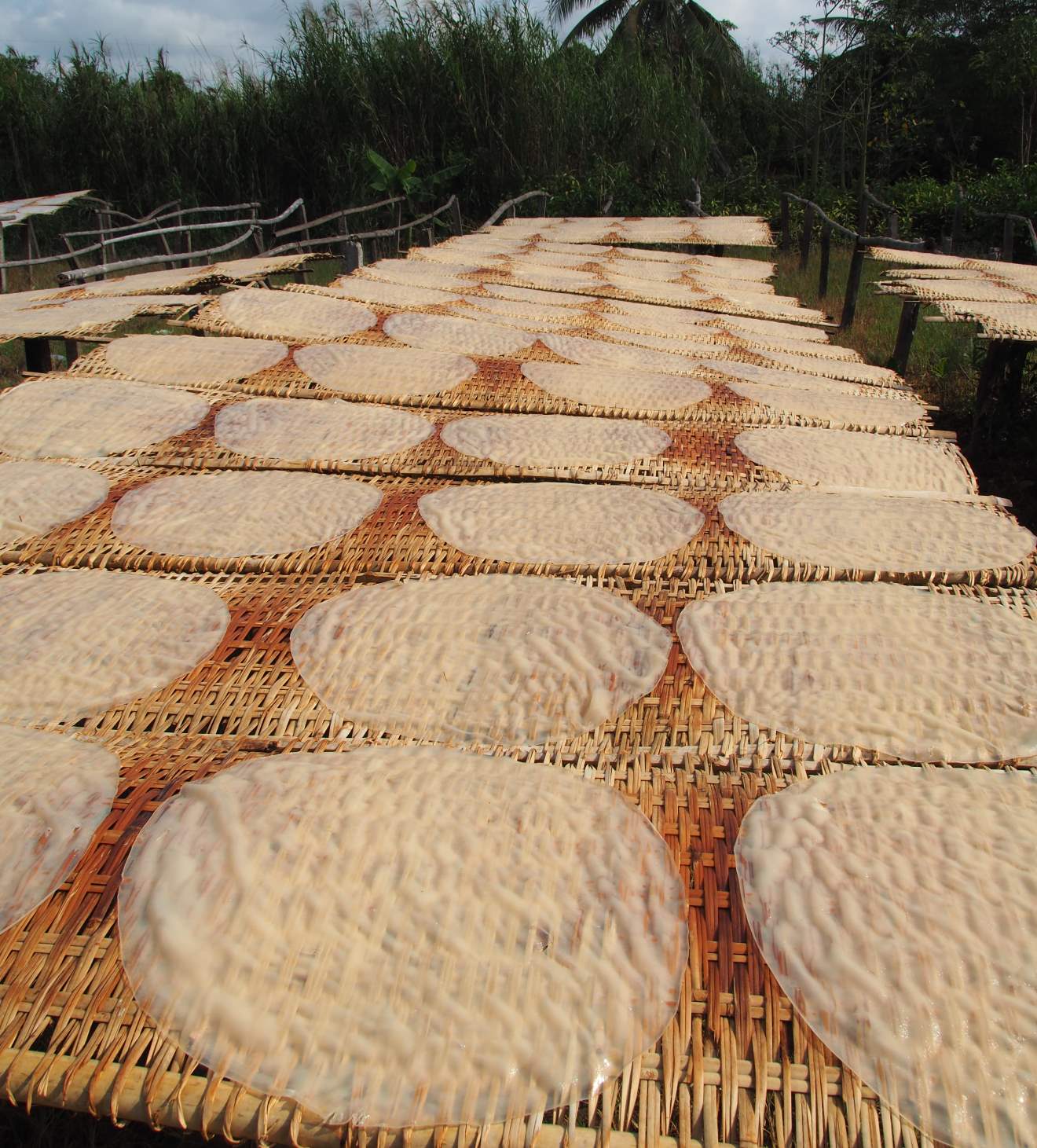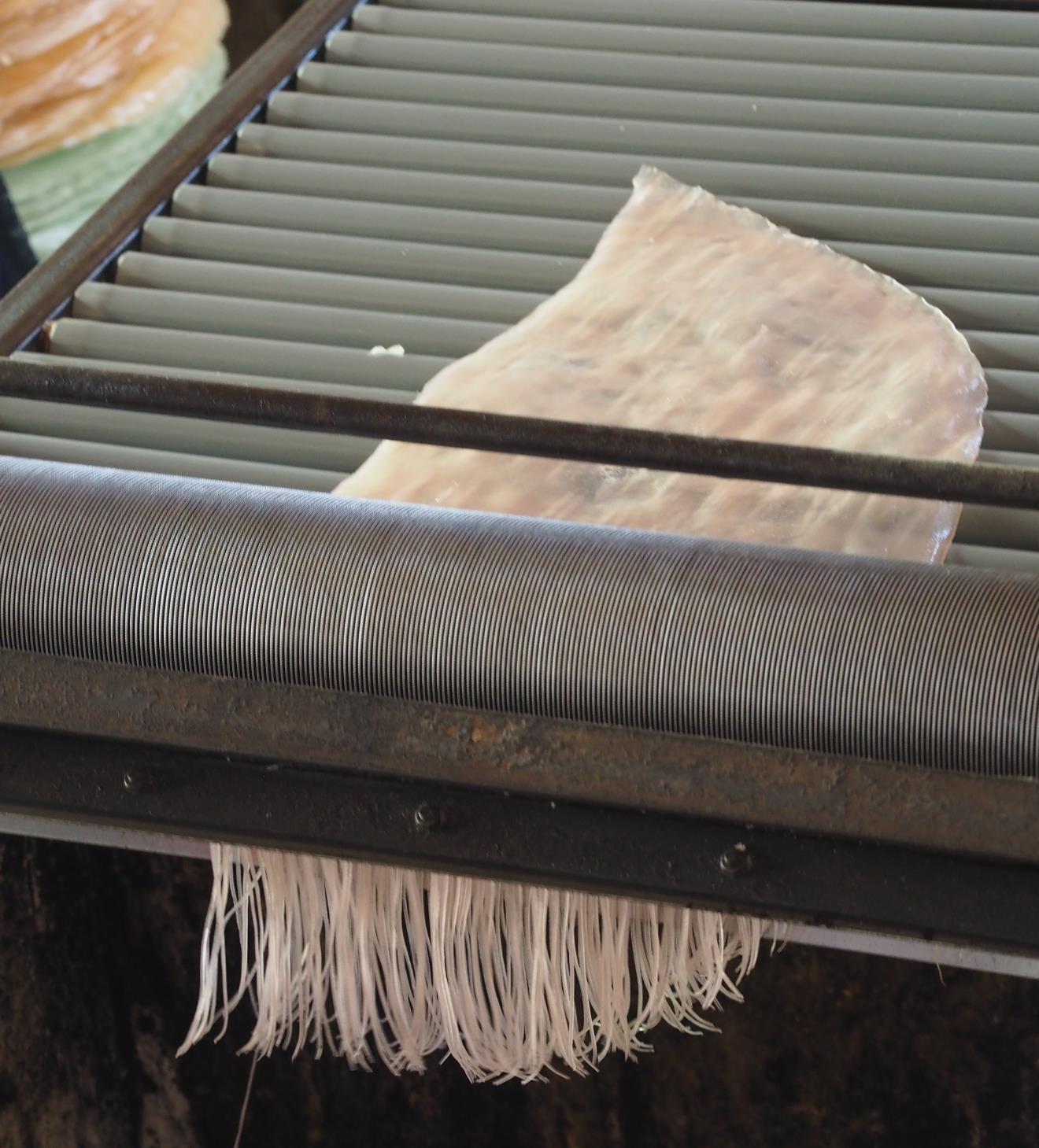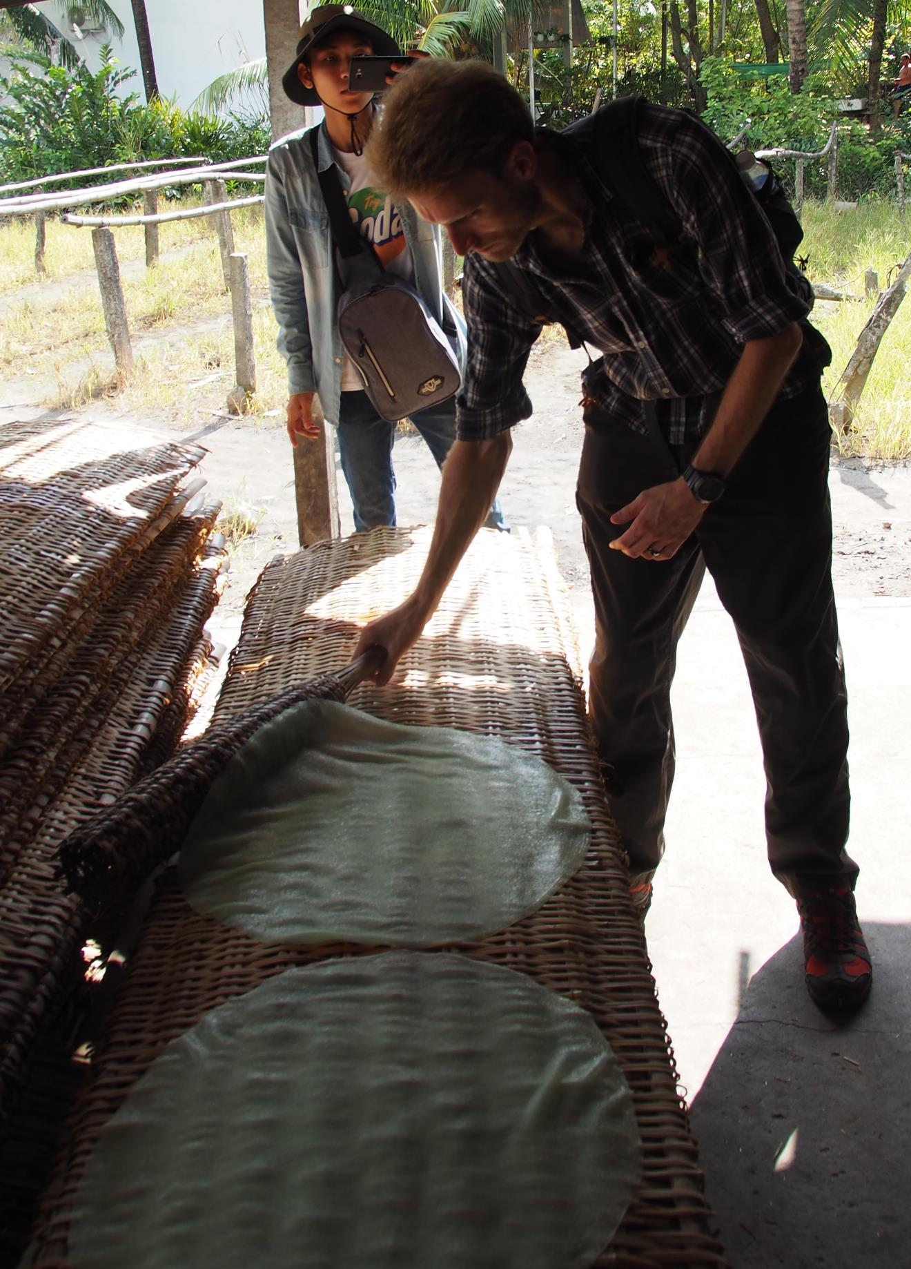 Once back on the boat, our next stop was to see how they make the rice noodles we’d had for breakfast. We went to a family run business where they turned a mixture of rice flour and tapioca into discs before drying them on bamboo sheets for three hours. Once dry they run them through a shredder to make noodles. Depending on what is ordered the noodles can either be plain or flavoured with turmeric or pandan leaves. We even got to have a go at transferring the discs to the bamboo!