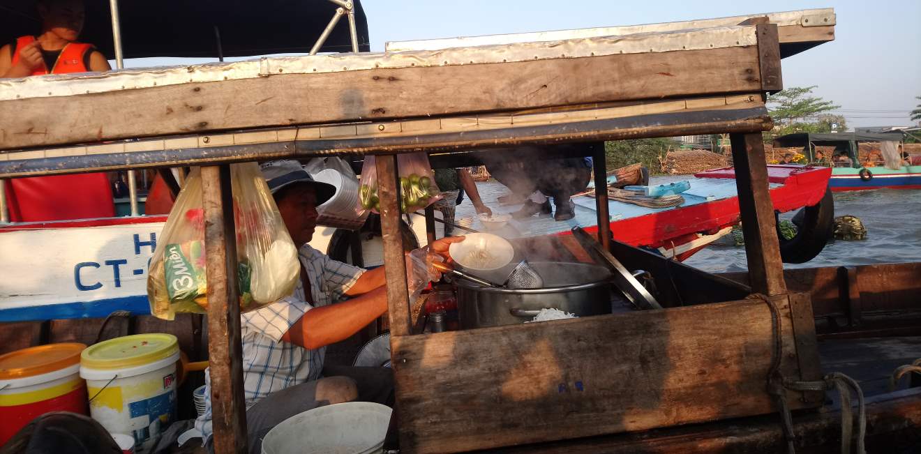 After getting some coffee and orange juice from one boat, we moored up against another boat which was serving pho for breakfast. It was really tasty and fun to eat it while watching all the bustle of the market around us. The boatsmen are really impressive, steering their sampans with their feet very adeptly so as not to hit anyone else. Our guide also bought us a sweet treat which was a disc of rice paper with dried bananas on.