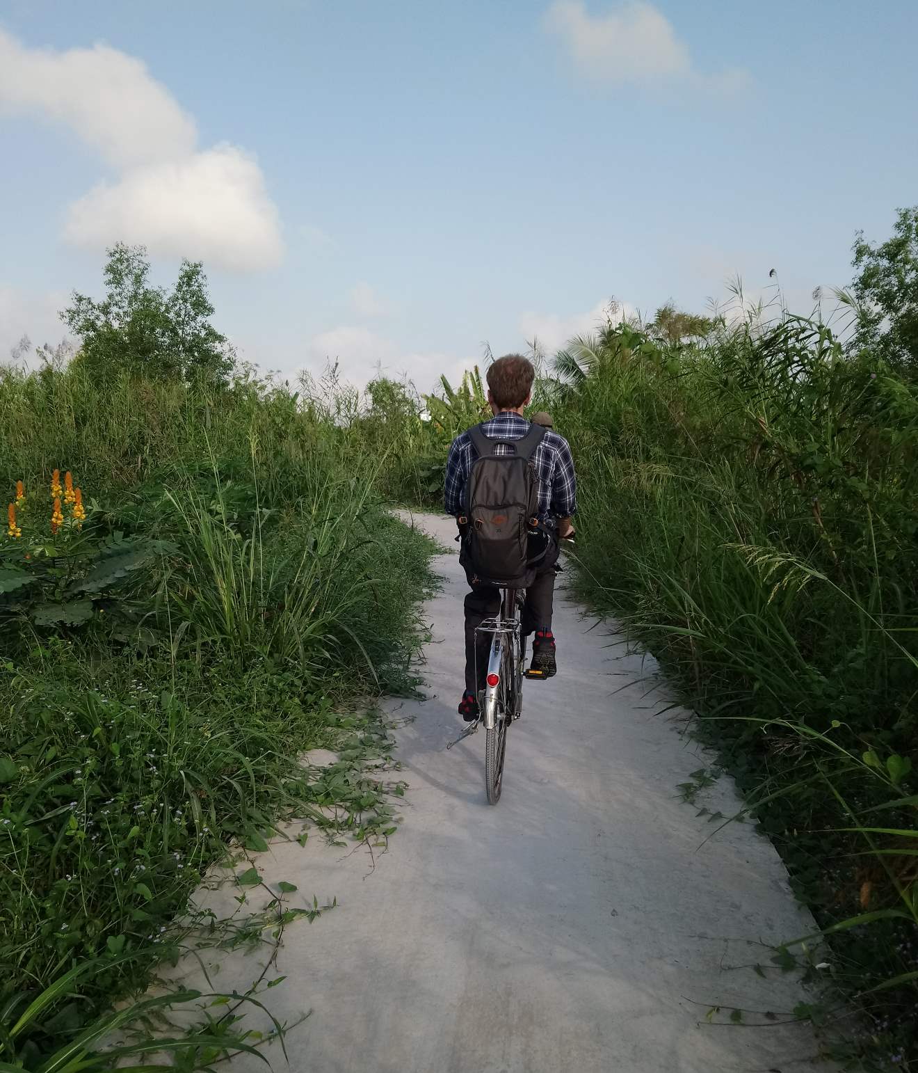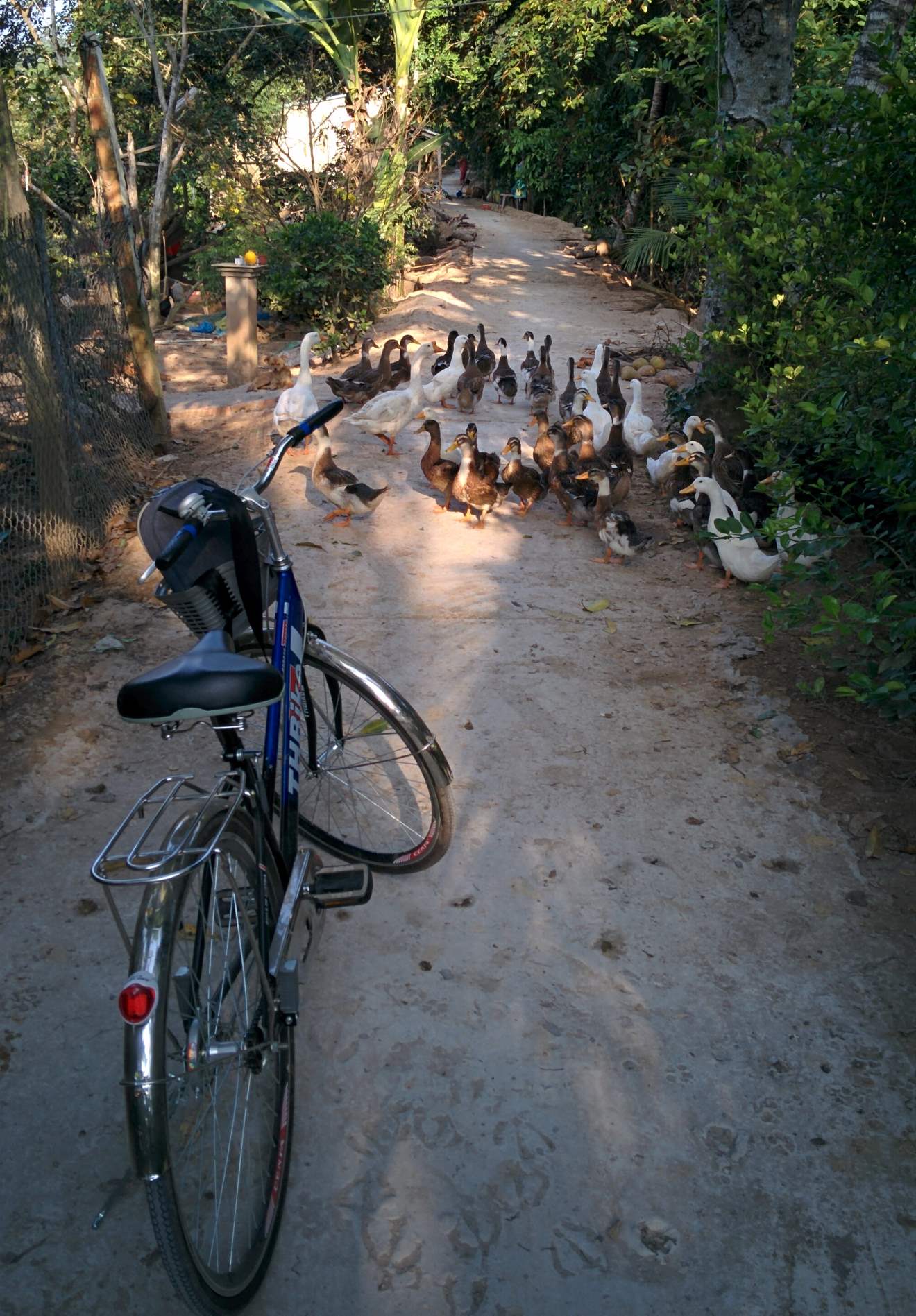 About fifteen minutes in, we rounded a corner to a large group of ducks and geese blocking our path and quacking or honking loudly! We had to dismount and walk slowly round them after a bit of shooing away. Apparently geese are good guard animals so people use them to protect their ducks, although thieves have realised that garlic pacifies them.