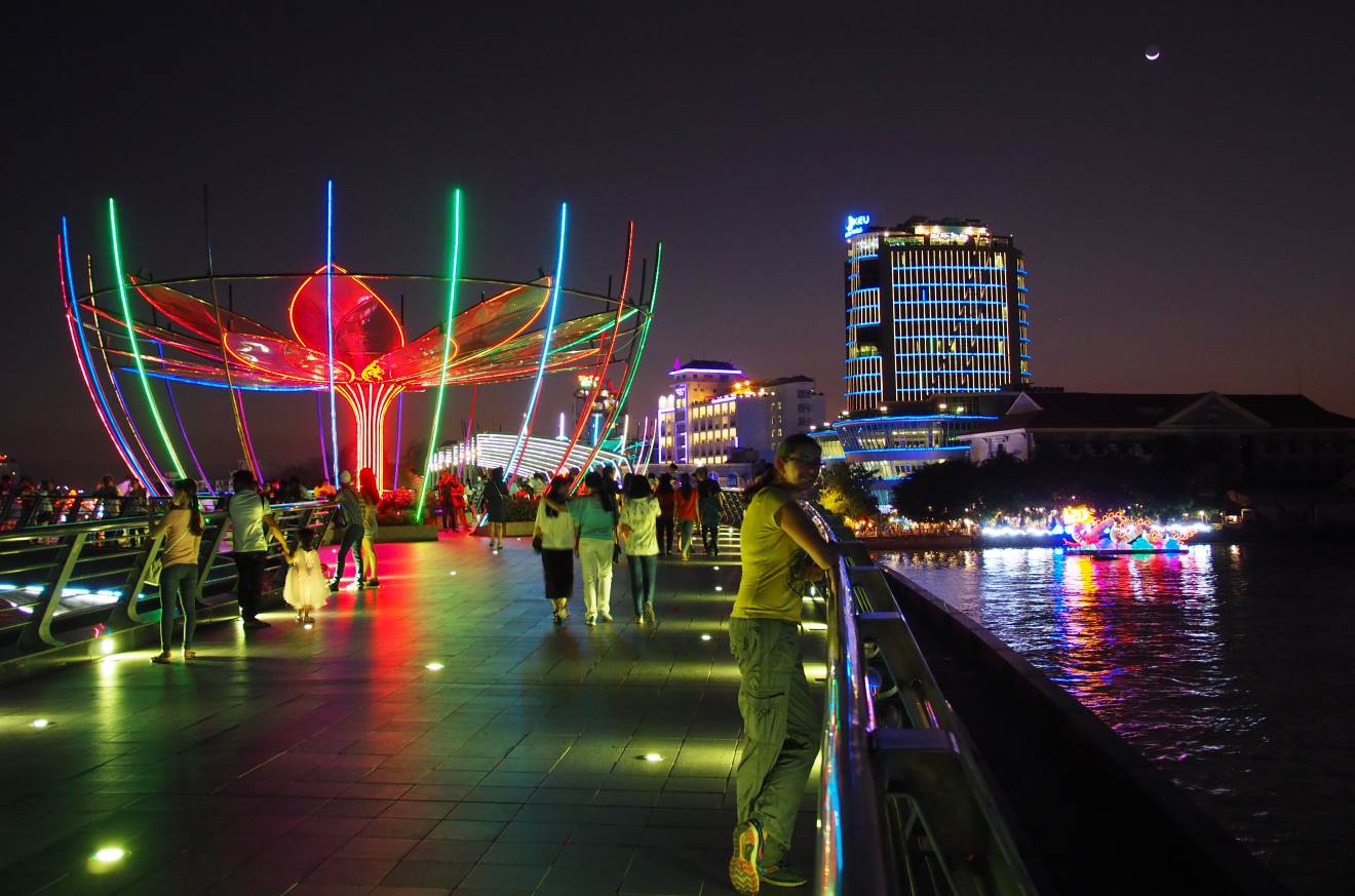 After checking into our hotel, we went for a wander to the Can Tho river, crossing over a very fancy pedestrian bridge adorned with two giant, fluorescent lotus flowers. We wandered through the park, past the Ho Chi Minh statue and down to the main street festooned with decorations and lights.