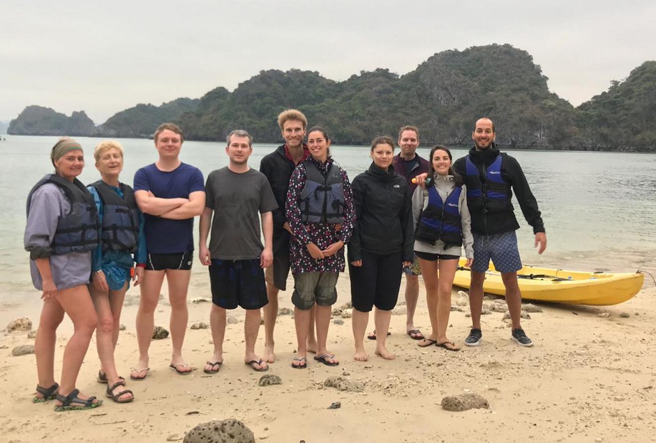 After lunch, we jumped into kayaks for a bit of sea kayaking to a nearby beach. It was amazing being in the water surrounded by massive karst outcrops. When we landed on the beach, James braved the cold water and went for a brief swim in the sea before playing see-saw with a large bamboo stick that had washed up on the beach.