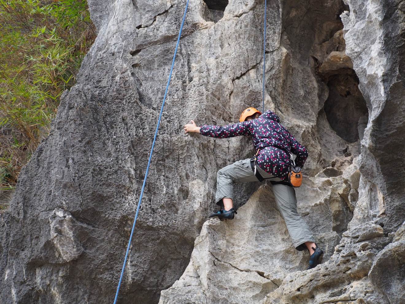 We woke to drizzle, which isn’t ideal for climbing, but we weren’t put off. After a breakfast of pho (first time it actually seemed to be reasonable to eat a hot bowl of soup for breakfast!), we were introduced to our climbing instructors and taken in a minibus to the pier. We boarded a junk boat and then transferred to a small tender which took us to Moody Beach. This was our own private climbing wall, where we spent three hours trying to climb various routes, some successfully, others less so! The views from the top were amazing though and even I enjoyed myself by the end!