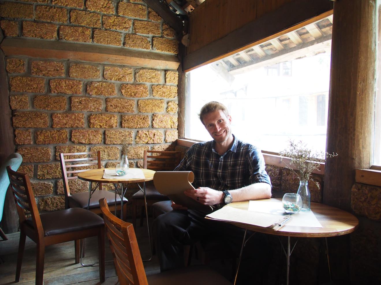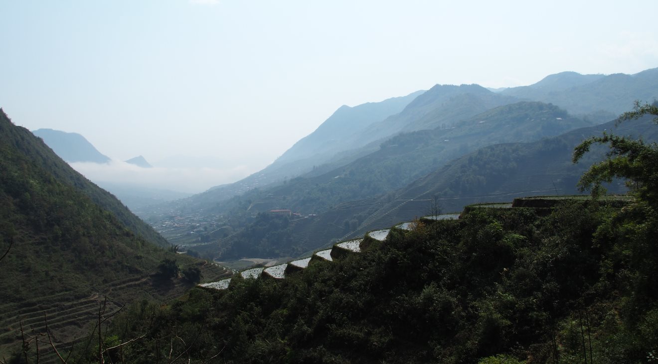 We arrived early, about 6:15am and after waiting around in a car park for 15 minutes, someone eventually came to meet us to take us to a hotel down the road for breakfast. The hotel had a fantastic balcony looking down into the valley, where we could see a large number of terraces cut into the hill and some rising mist coming up the valley. The mist reminded me of the Alps when we’ve been skiing.