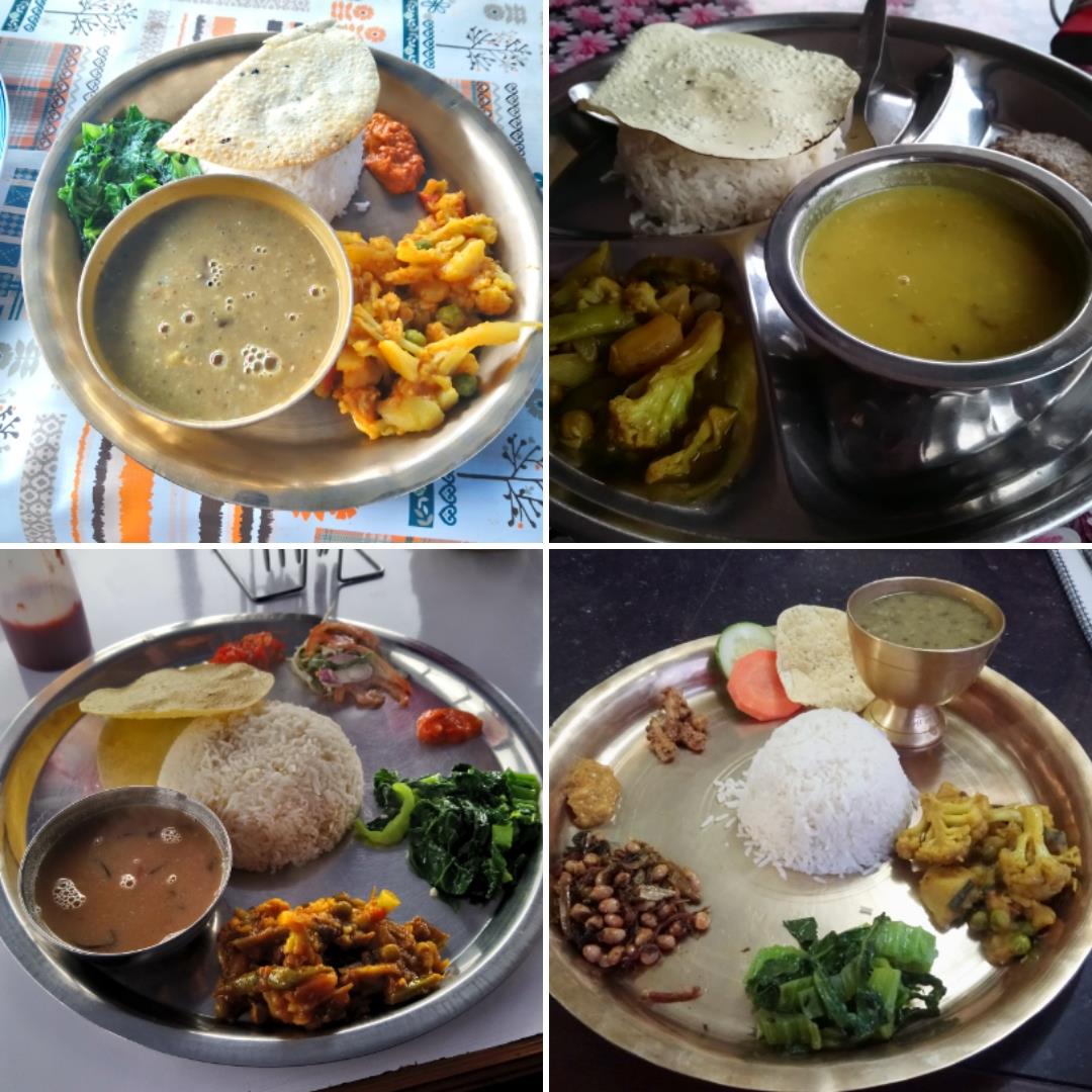 I mentioned daal bhat in my trekking post, but it was the staple of our diet here and something Ram ate twice a day. While the premise was the same everywhere (rice, curry, lentils, greens), the extras varied at each place. Here’s a selection of some of the ones we had.