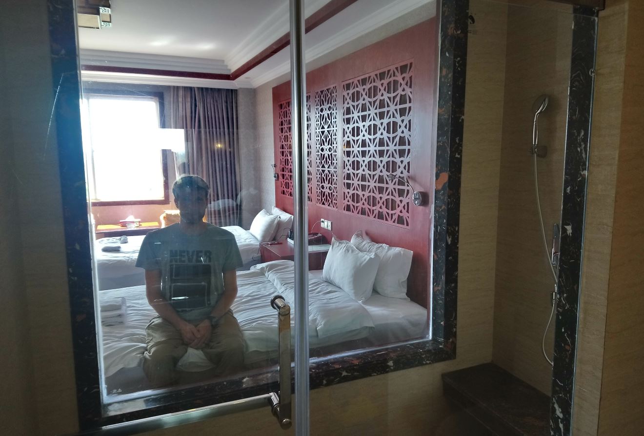 We’d chosen to stay at the New Aye Yar hotel to the south of Nay Pyi Taw as we’d read that the bus would drop us there on the way, and this proved to be the case. So at 12:45 we were dropped on the side of a road in the middle of nowhere. A short walk later, we were checked into a rather large, but quite deserted hotel. Weirdly, our room had an automatic blind between the bathroom and the bedroom. Needless to say, we kept that down!