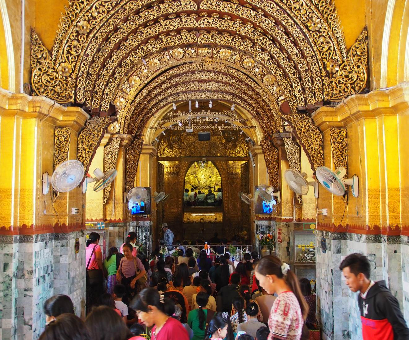 Our taxi driver had waited for us and after a quick stop back at the hotel to collect our washing, pack up and check out, we headed south towards the airport. Our driver suggested we stop off at two main attractions on the way, Mahamuni Pagoda and U Bein Bridge. Mahamuni Pagoda is a big complex, at the centre of which is a Buddha statue that male Buddhists constantly top up with gold leaf (women aren’t allowed). This is the main temple for Buddhists in Mandalay and holds special significance for them.
